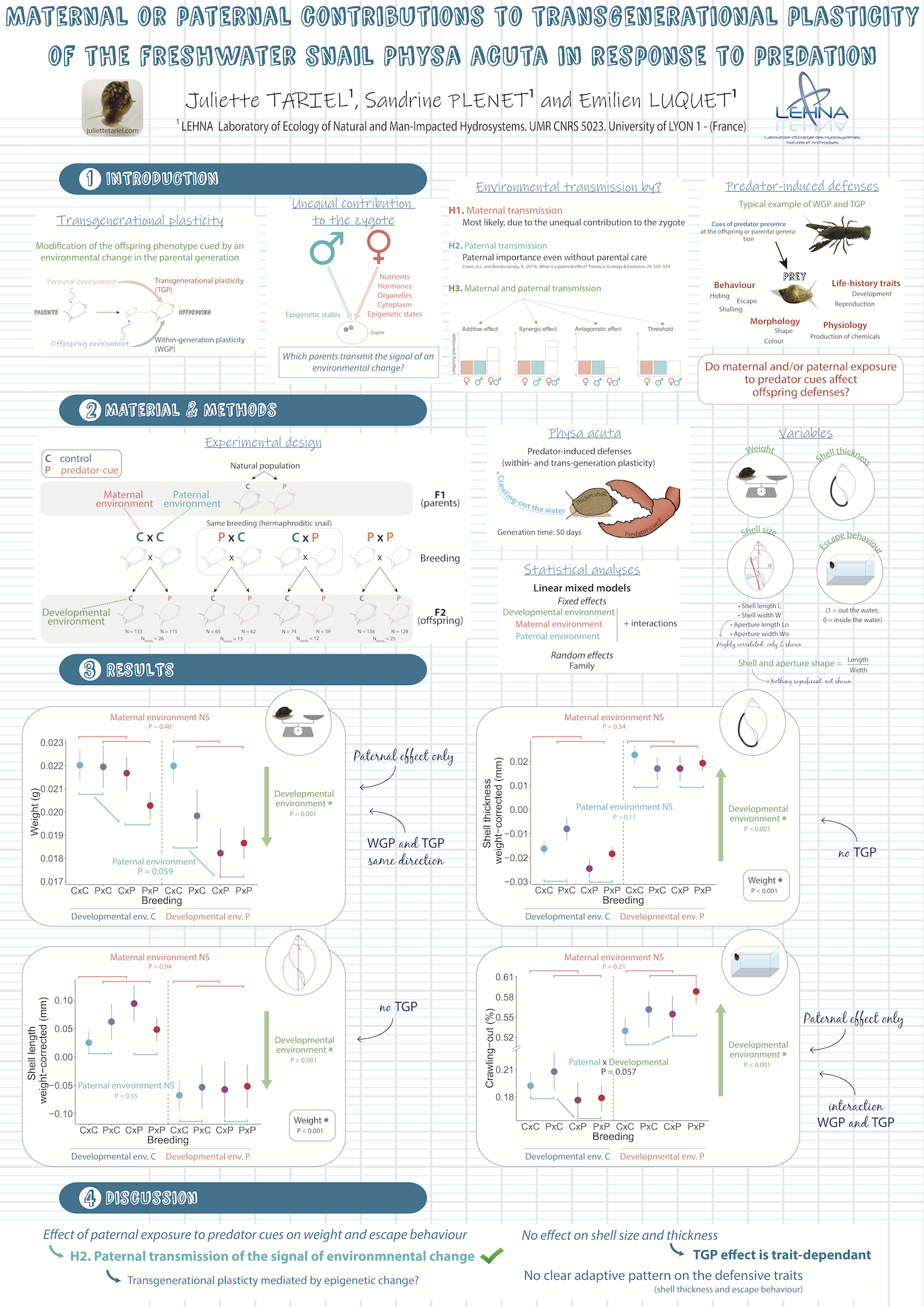 - Juliette TARIEL – Maternal or paternal contributions to transgenerational plasticity of the freshwater snail Physa acuta in response to predation (LEHNA, Lyon) – Session EVOLUTION
