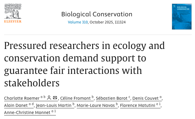 Roemer, C., Fromont, C., Barot, S., Couvet, D., Danet, A., Martin, J. L., Navas, M.L., Matutini, F. & Monnet, A. C. (2025). Pressured researchers in ecology and conservation demand support to guarantee fair interactions with stakeholders. Biological Conservation, 111324. https://doi.org/10.1016/j.biocon.2025.111324