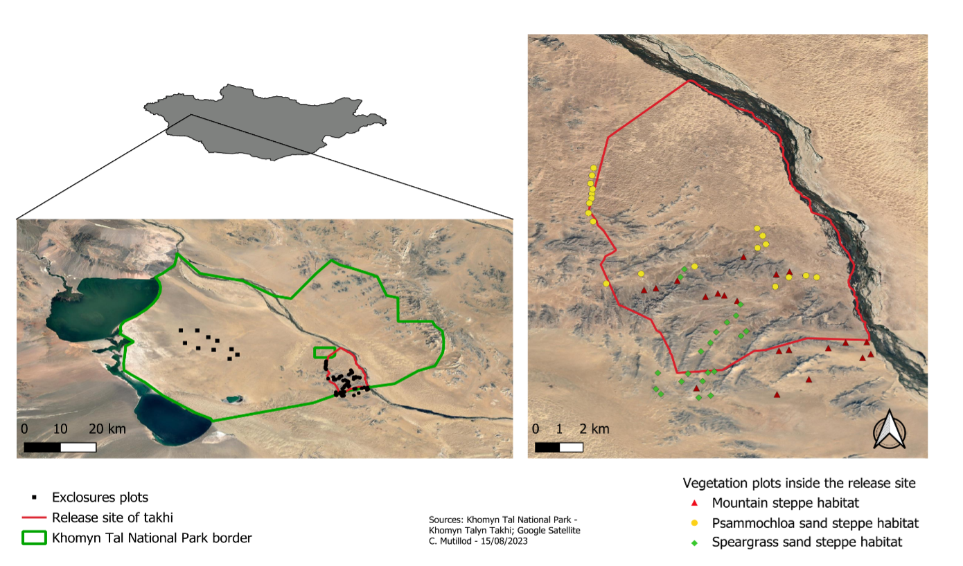 En 2004 et 2005, des groupes familiaux de chevaux de Przewalski ont été réintroduits en Mongolie dans une zone close au sein de ce qui est aujourd’hui le Parc National de Khomyn Tal. Le site clos de lâcher permet d’étudier les effets du pâturage des chevaux réintroduits sur les communautés végétales et de les comparer aux pratiques en dehors de cette zone, notamment avec la présence de grands troupeaux d’animaux domestiques (chevaux, moutons, chèvres, chameaux) (Joly et al., 2013). En 2010, des suivis ont été réalisés à l’intérieur et à l’extérieur du site de lâcher des chevaux de Przewalski. Aujourd’hui, la population de chevaux a continué de croître, passant de 12 à 144 (Khomyn Talyn Takhi communication), et une augmentation similaire a aussi pu être mesurée au sein des troupeaux domestiques (National Statistics Office of Mongolia, 2023).