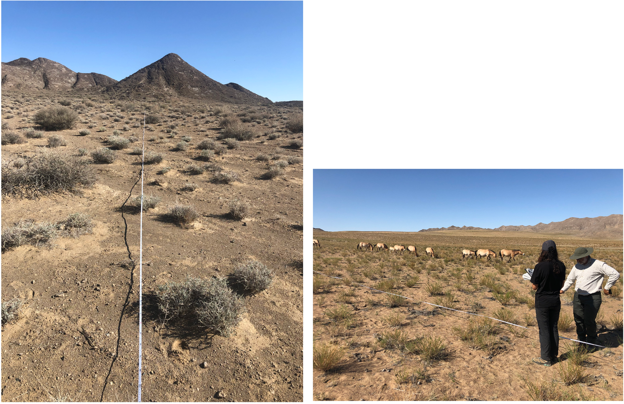 Fig. 4 : Transect de 50m dans l’habitat mountain steppe. Fig. 5 : Transect de 50m dans l’habitat speargrass sand steppe avec la visite de chevaux de Przewalski curieux.