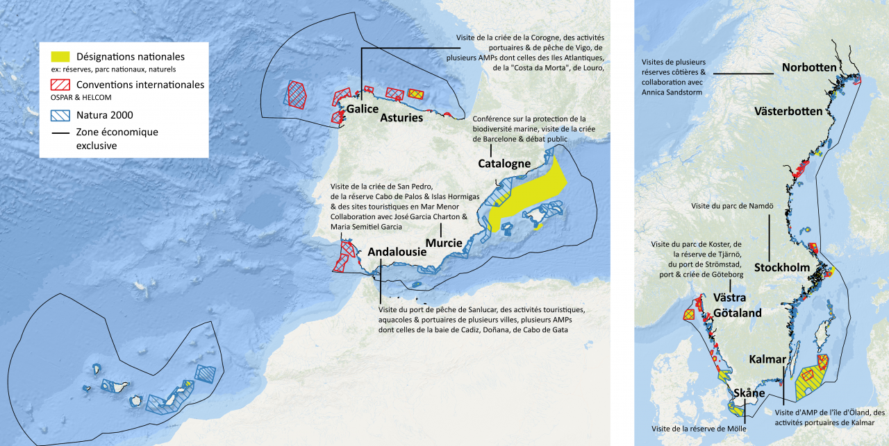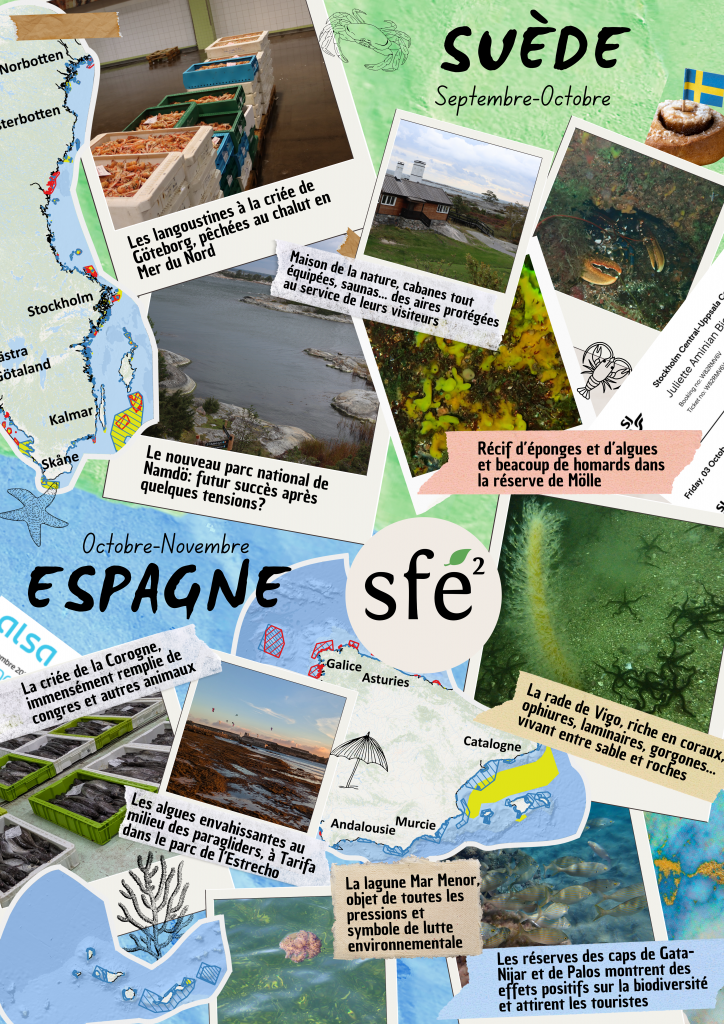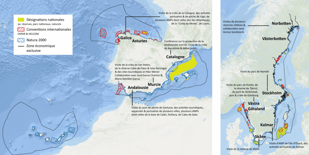 La bourse de terrain de la Sfe² a permis de réaliser des enquêtes de terrain en Espagne et en Suède, pour 1) réaliser des entretiens en personne, 2) visiter des aires protégées côtières identifiées dans les entretiens et des sites importants dans le tissu socio-économique (criées, sites touristiques, centres de sensibilisation, une conférence dédiée) et 3) de collaborer avec les scientifiques partenaires. Les sites visités lors des enquêtes de terrain sont présentés en Figure 1. La Figure 2 illustre certains de ces sites et leurs enjeux.