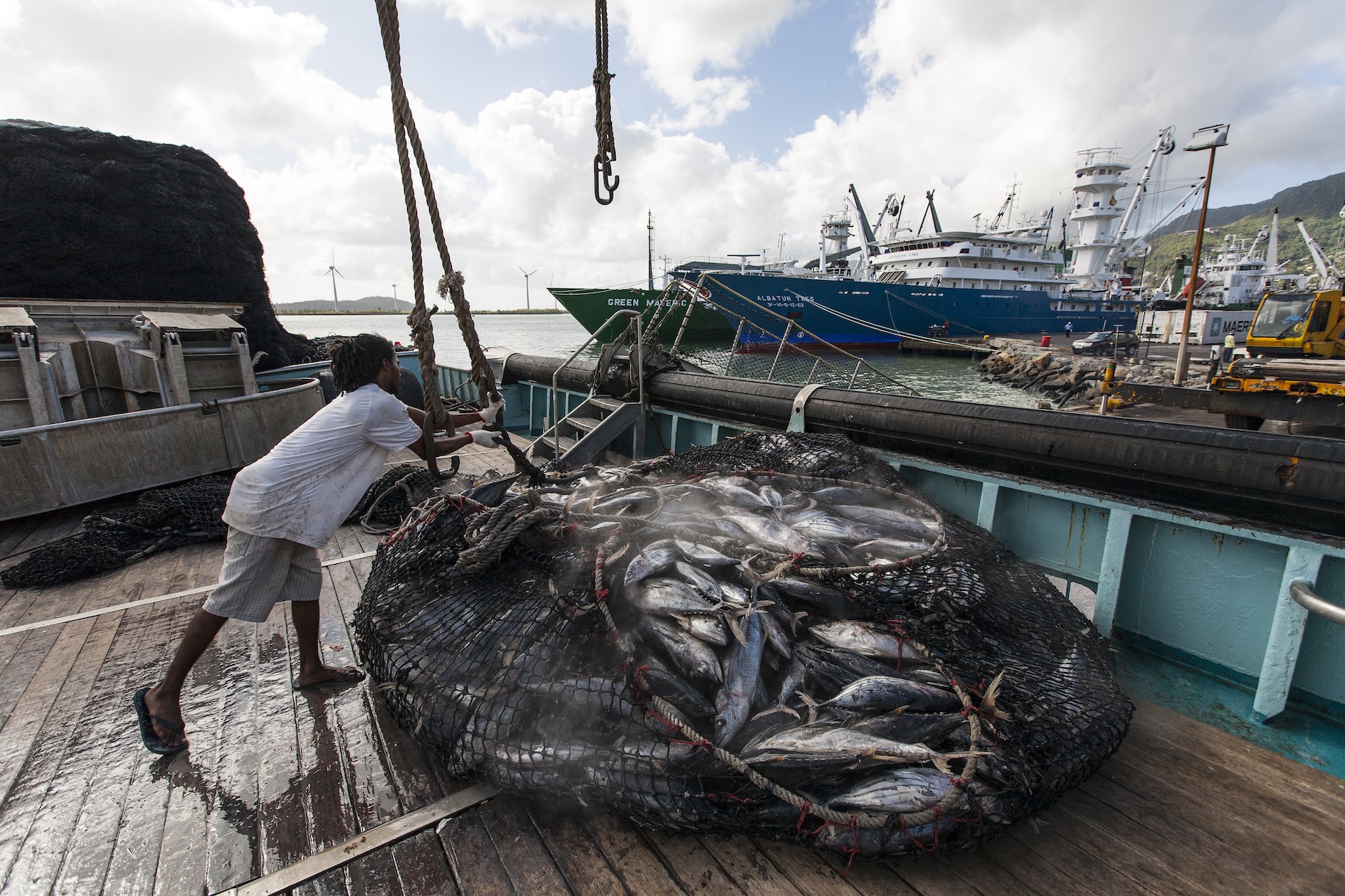 Fig.1 : Débarque de thon congelé à bord d’un thonier-senneur industriel dans le port de pêche de Victoria, Mahé. Le thon pêché par les navires industriels et congelé en saumure est destiné exclusivement à la a transformation en boites de thon. Une grande partie est immédiatement transformée dans l’usine Thaï Union de Victoria (Petit Navire, etc.), l’une des plus grandes du monde. © IRD / Thibaut Vergoz